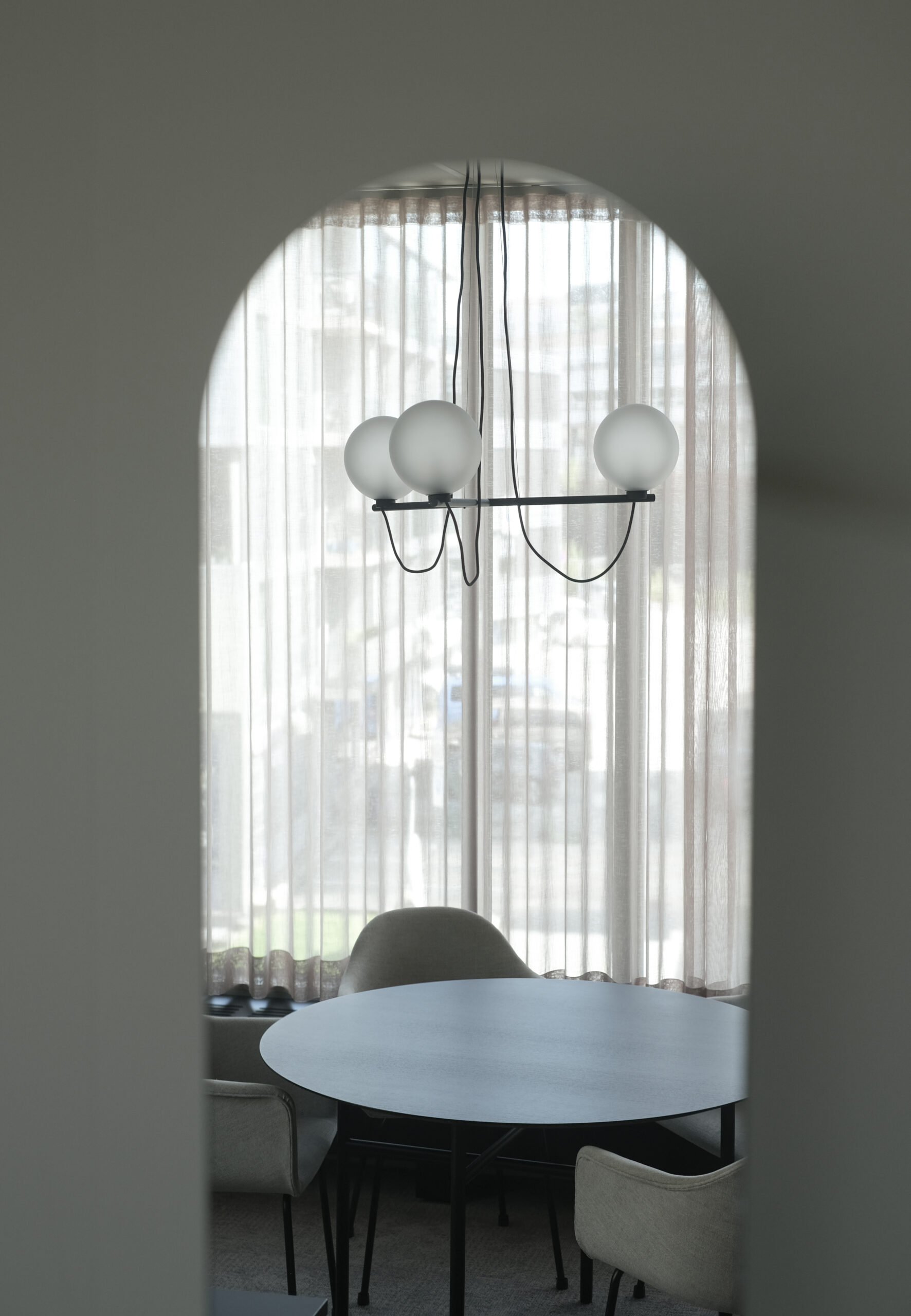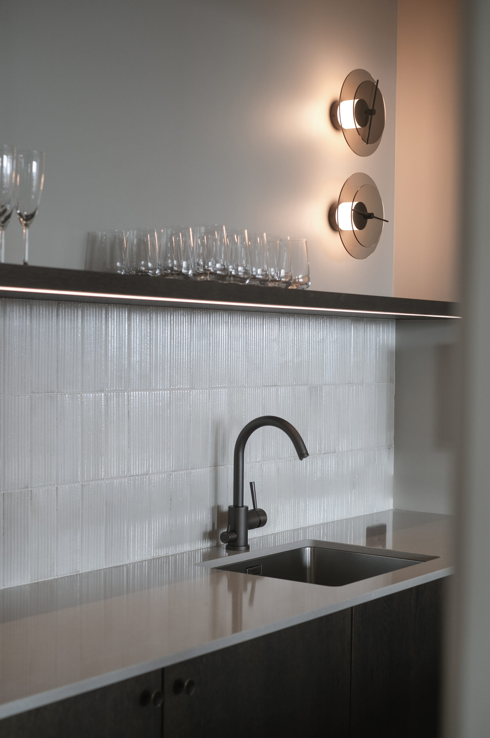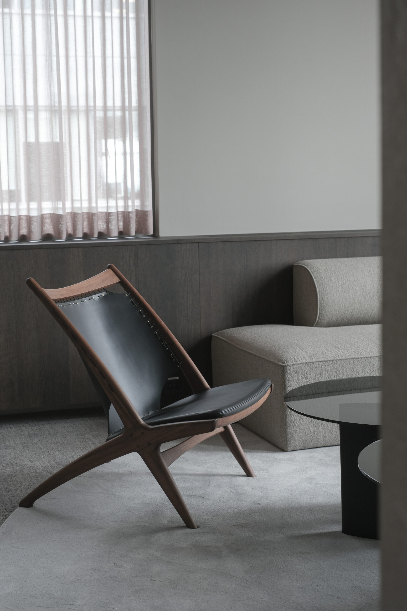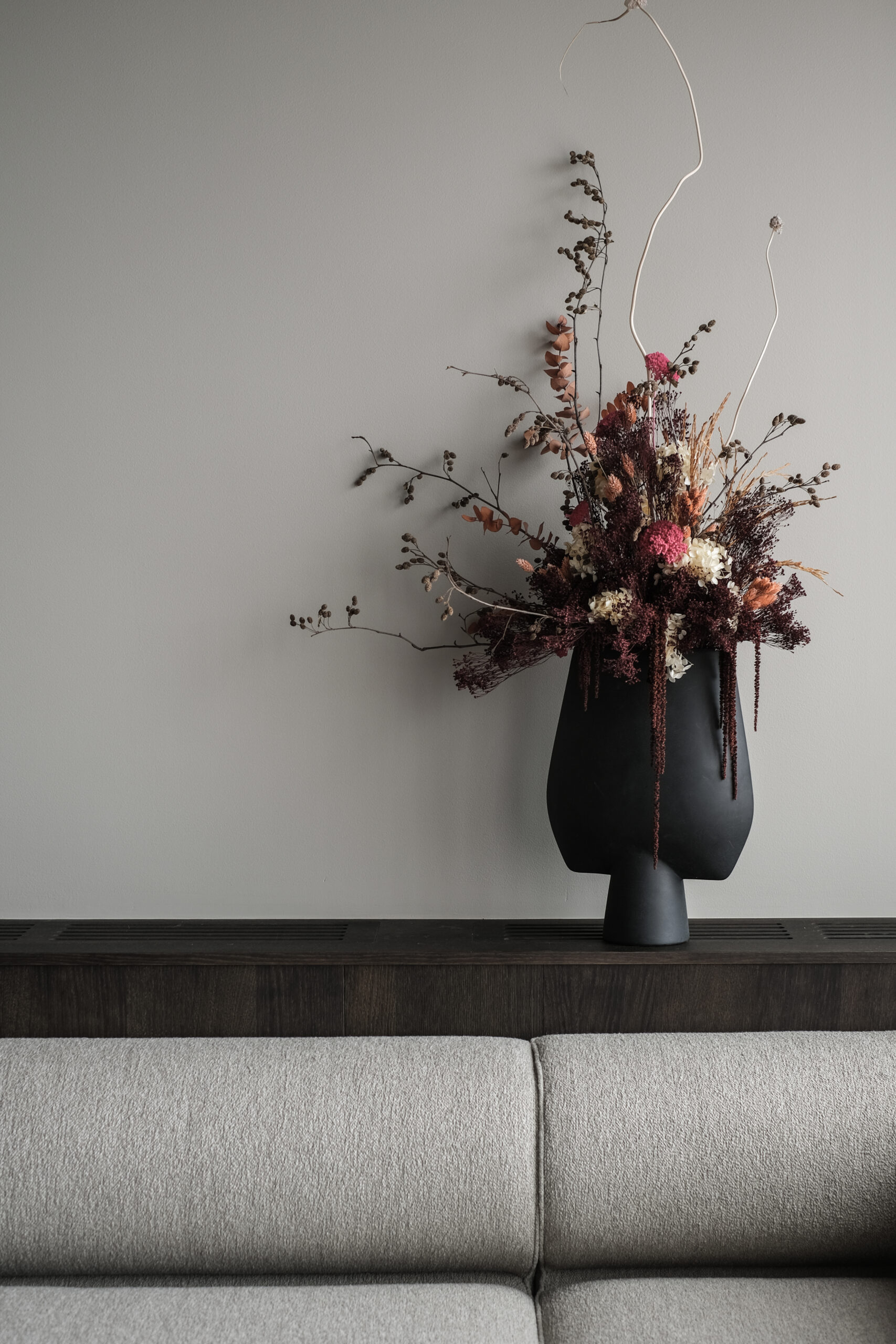 Totalt 900 kvadratmeter er totalrenovert og tilpasset med gjennomtenkte materialvalg og løsninger. En nedtonet og elegant palett i lyse beige toner, sort og mørkbeiset eik gir interiøret et sofistikert preg. Naturlig lys og utsikten spiller en viktig rolle – her er det rom for fokus, samarbeid og nytenkning.