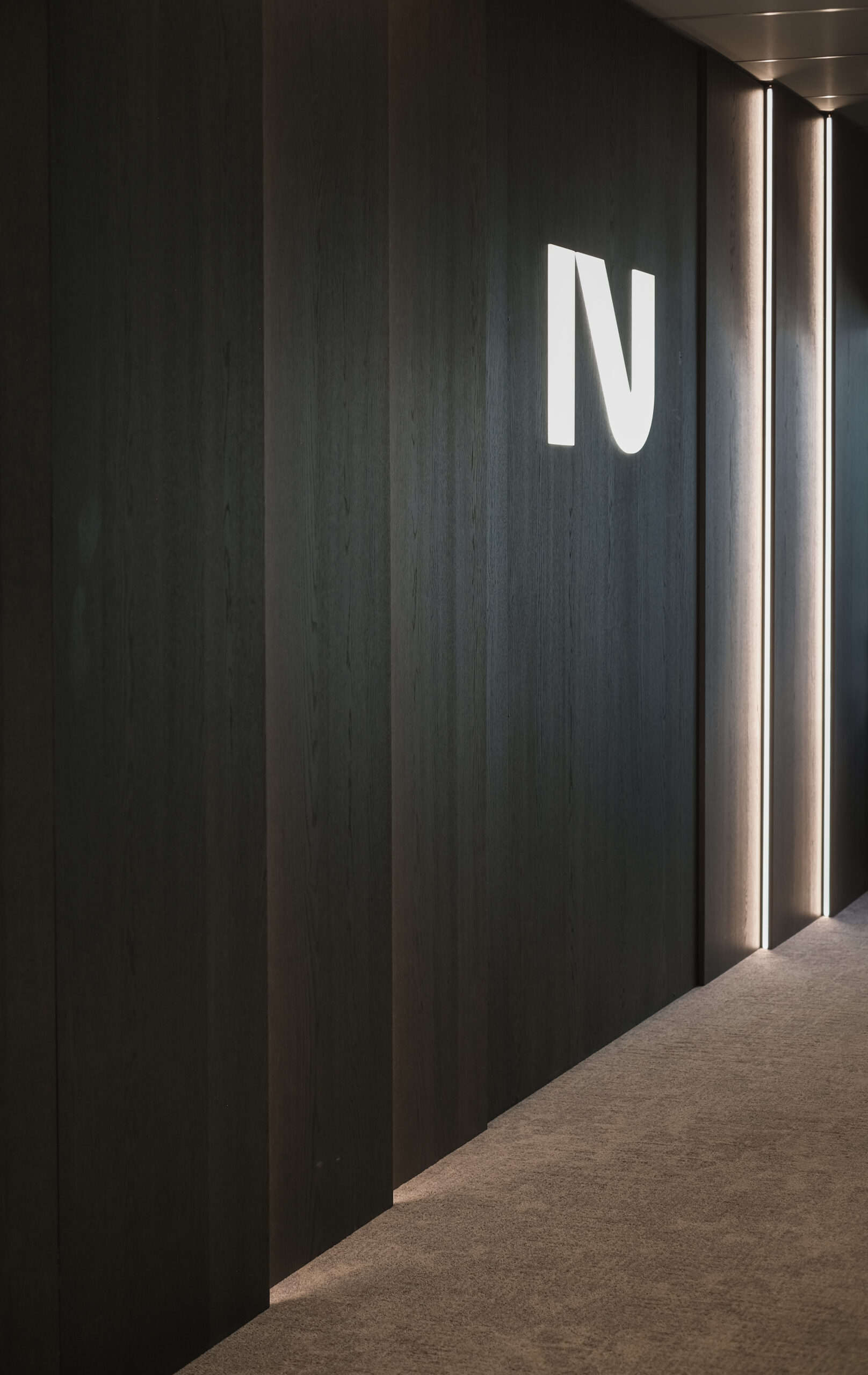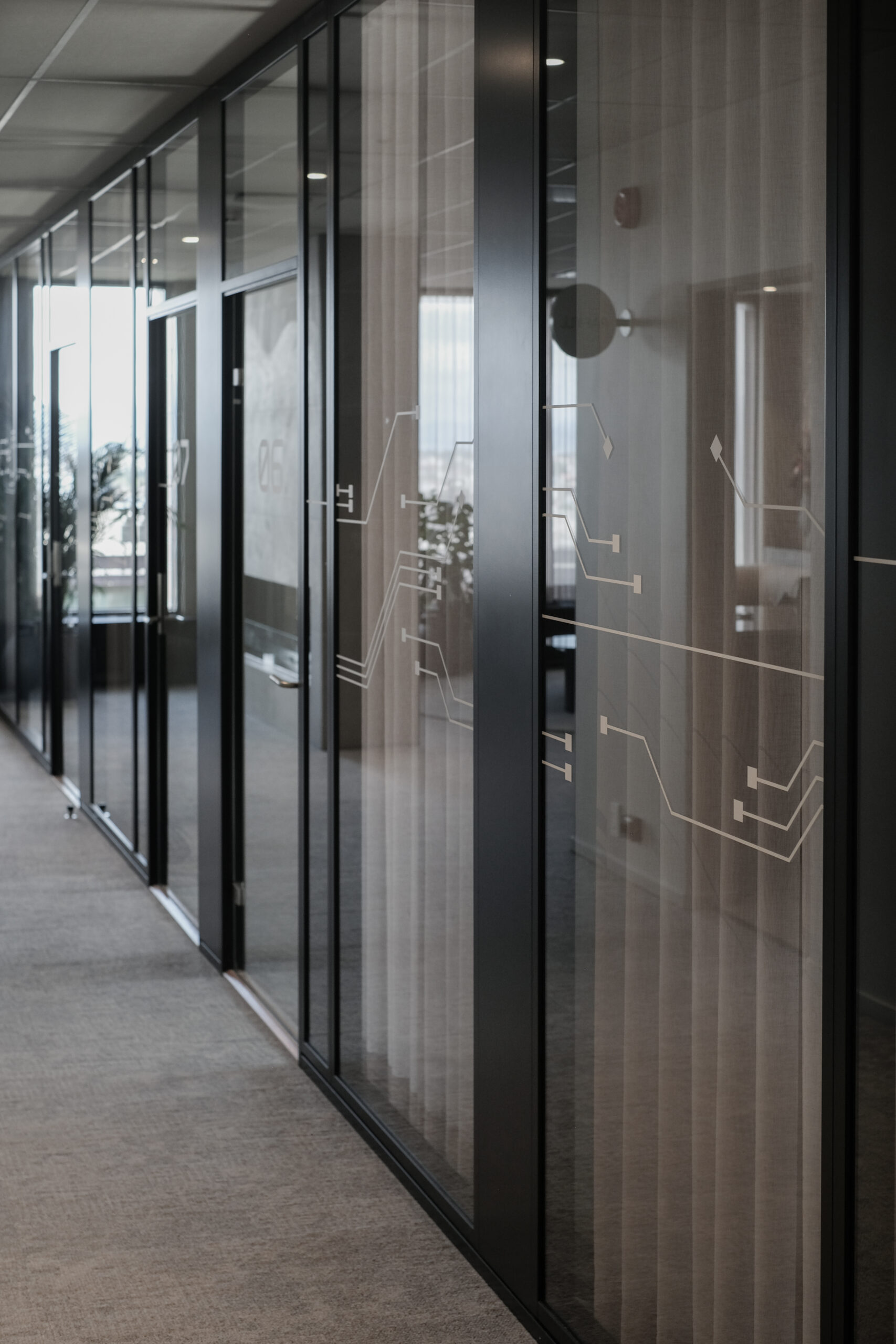 Detaljene er nøye ivaretatt: foliedesignet formidler strømmen av informasjon, og skaper en visuell identitet som understreker Noovas teknologiske og innovative profil. Nummerering av kontorer og møterom gjør det enkelt å finne frem, og bidrar til et helhetlig, funksjonelt miljø.