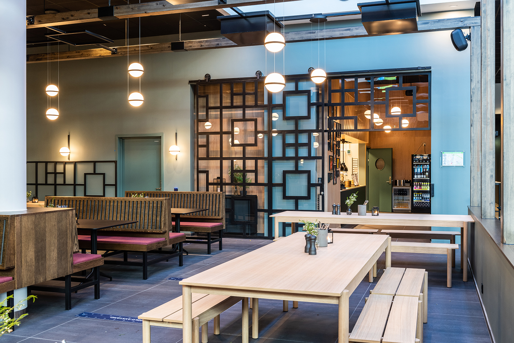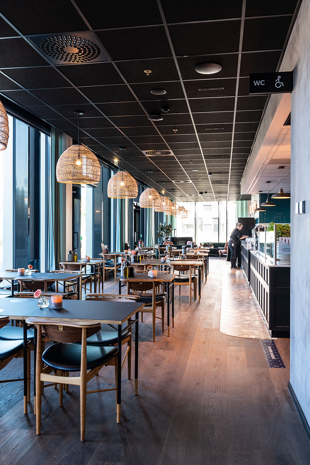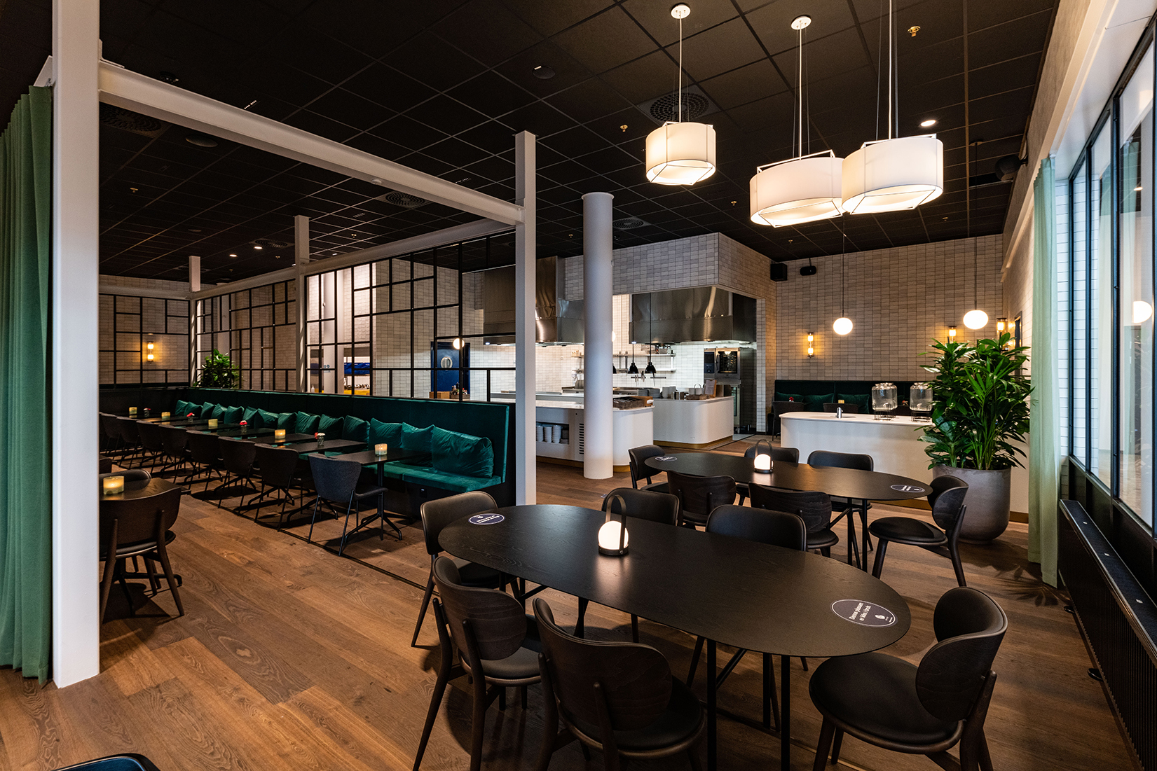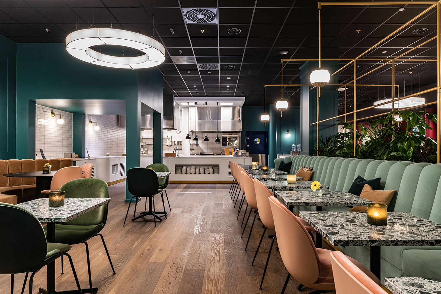 Funksjonene i paviljongen er offentlig tilgjengelige, samt et tilbud for kontorbrukerne. Dette markedsområde består av varierte kafeer og restauranter som serverer alt fra gourmetmåltider til Street Food og kaffe. De ni restaurantene har ulike konsepter og til sammen 1.100 sitteplasser. Her har vi hatt fokus på bærekraftige og funksjonelle løsninger av høy kvalitet, som skal tåle hard bruk i lang tid. Vi jobbet tett med kunde for å finne den optimale møbelpakken til det visuelle uttrykke de ønsket.