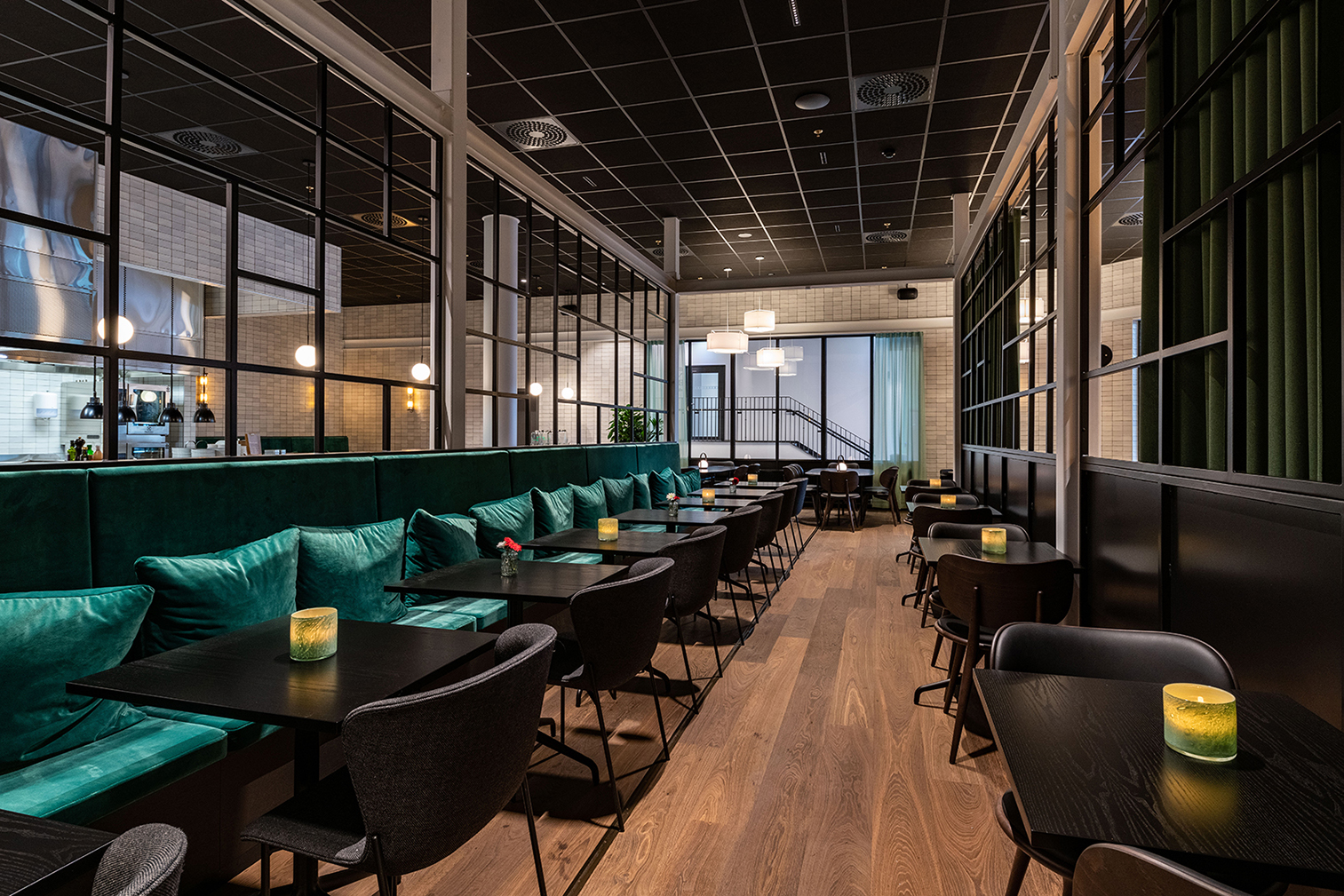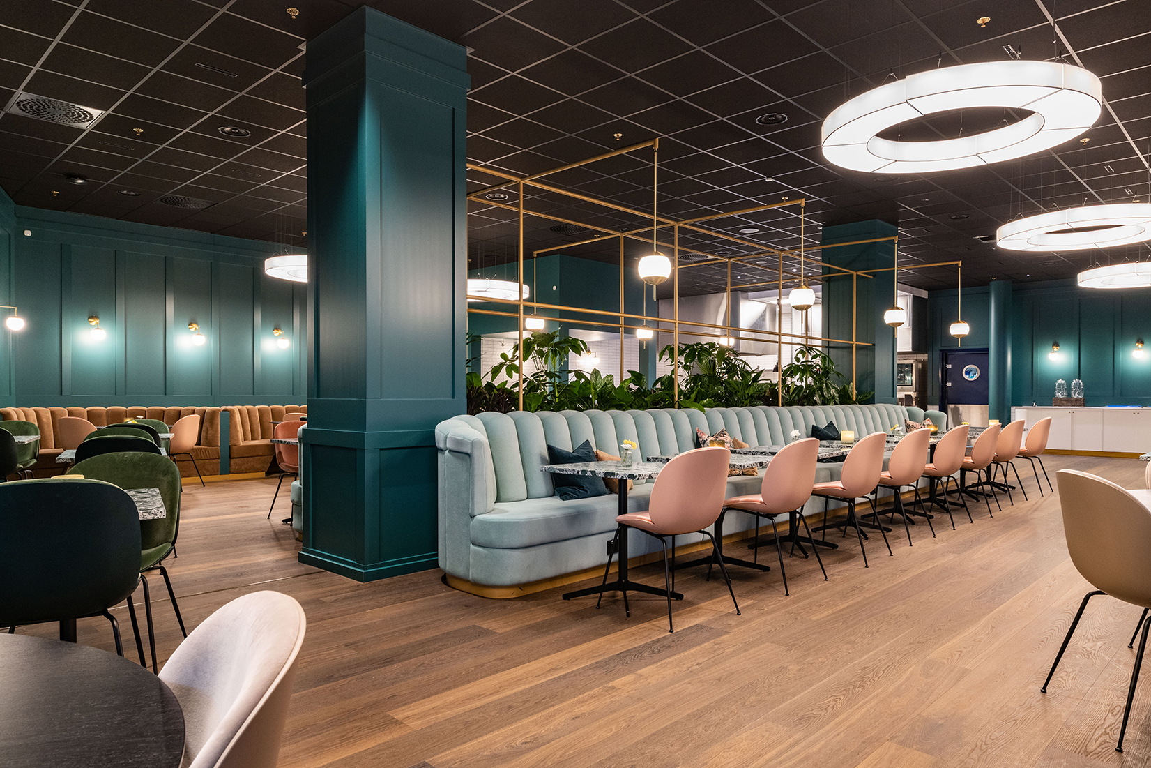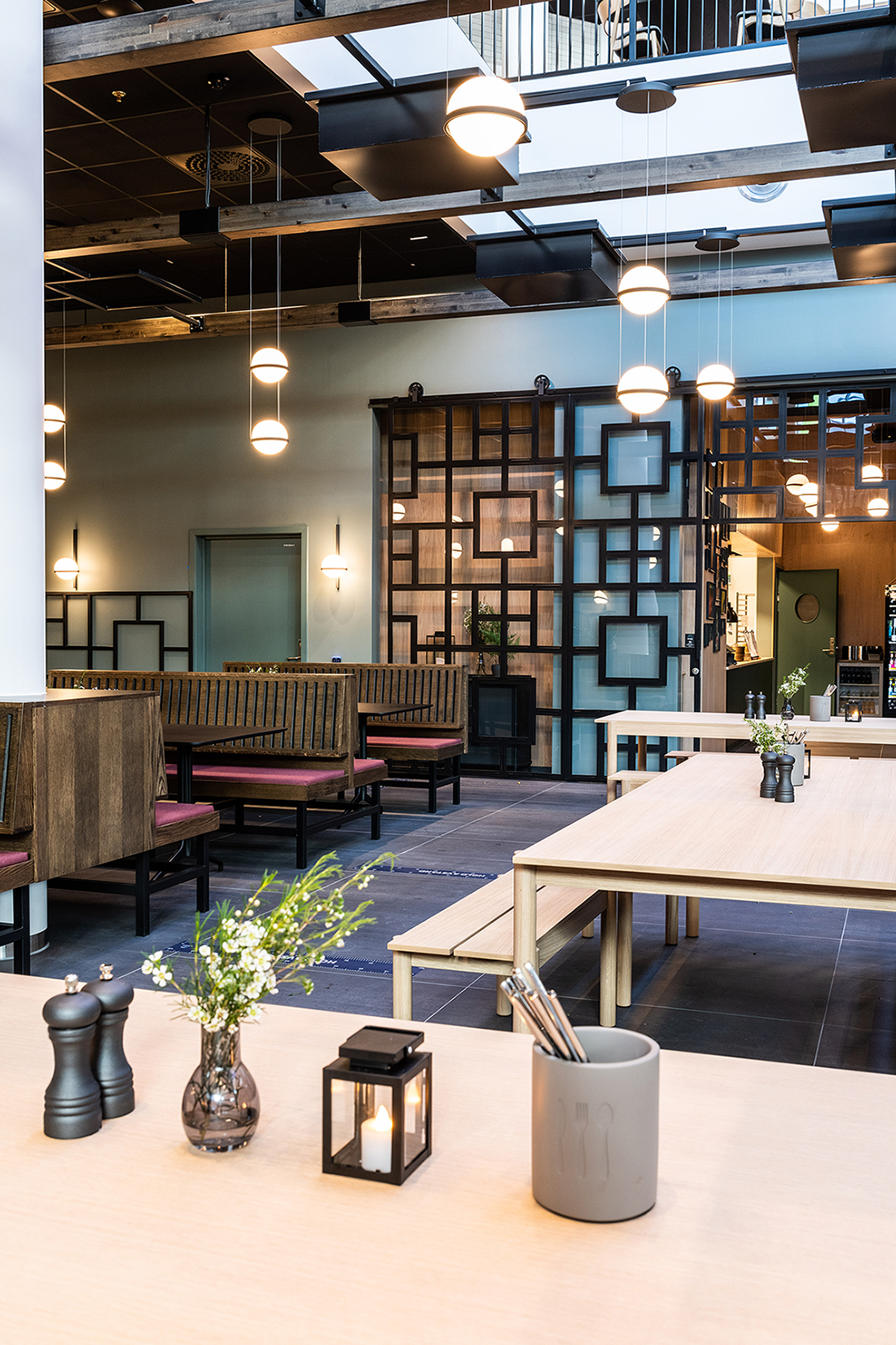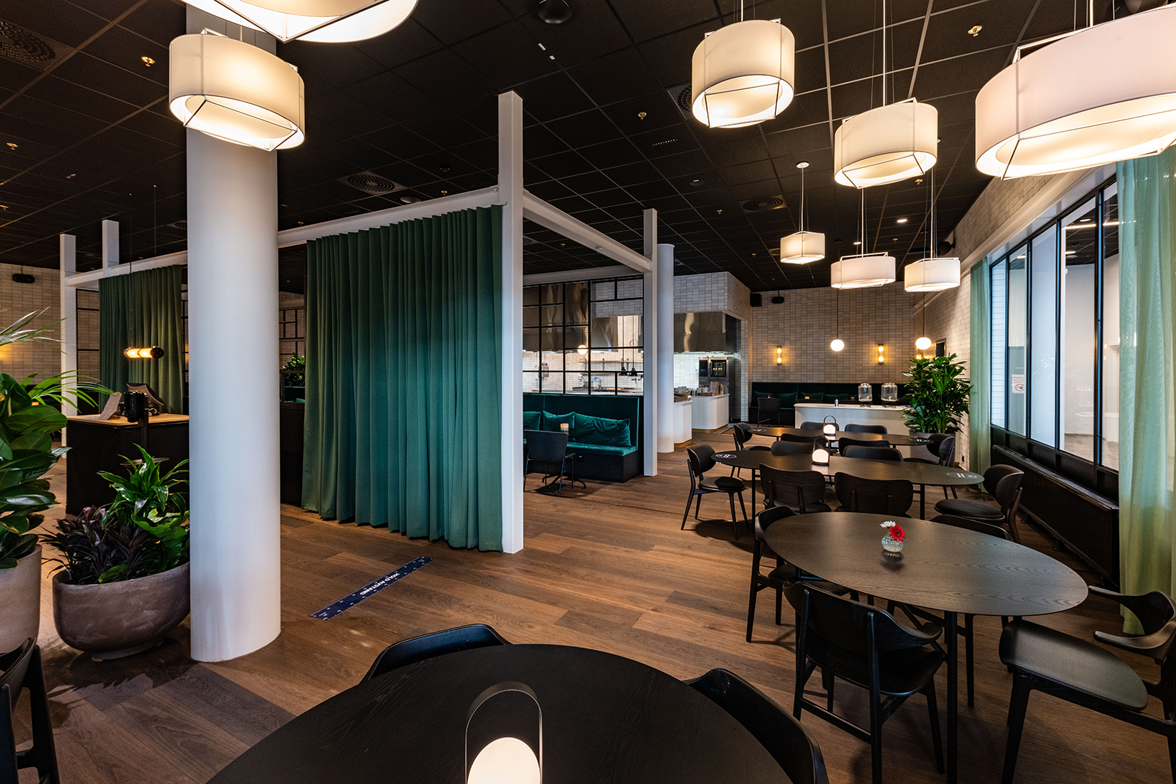 Funksjonene i paviljongen er offentlig tilgjengelige, samt et tilbud for kontorbrukerne. Dette markedsområde består av varierte kafeer og restauranter som serverer alt fra gourmetmåltider til Street Food og kaffe. De ni restaurantene har ulike konsepter og til sammen 1.100 sitteplasser. Her har vi hatt fokus på bærekraftige og funksjonelle løsninger av høy kvalitet, som skal tåle hard bruk i lang tid. Vi jobbet tett med kunde for å finne den optimale møbelpakken til det visuelle uttrykke de ønsket.