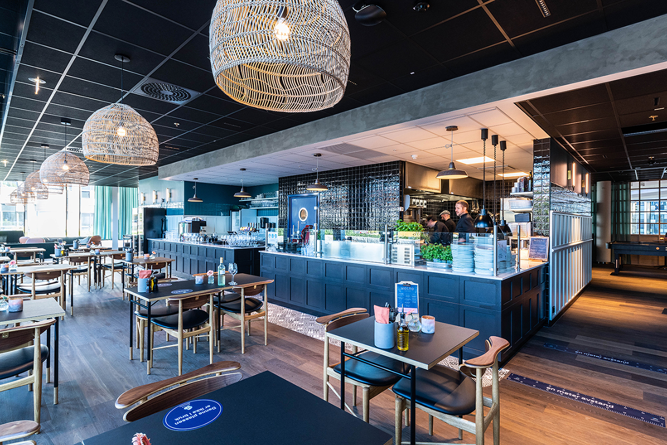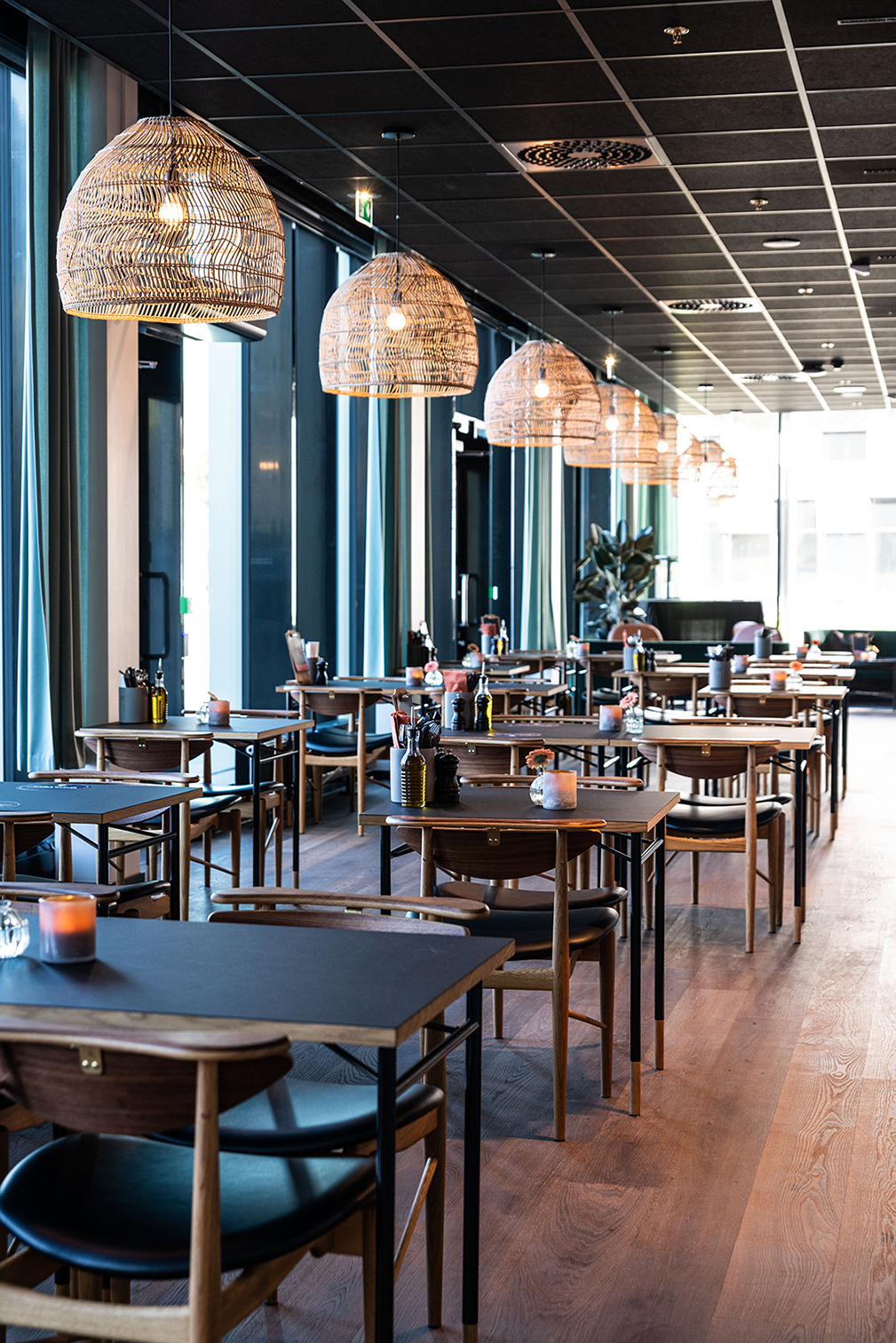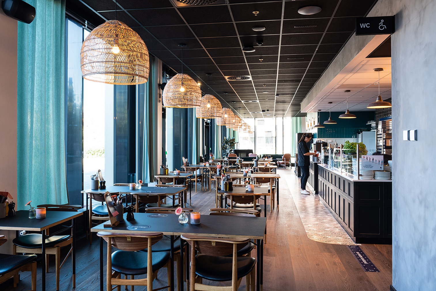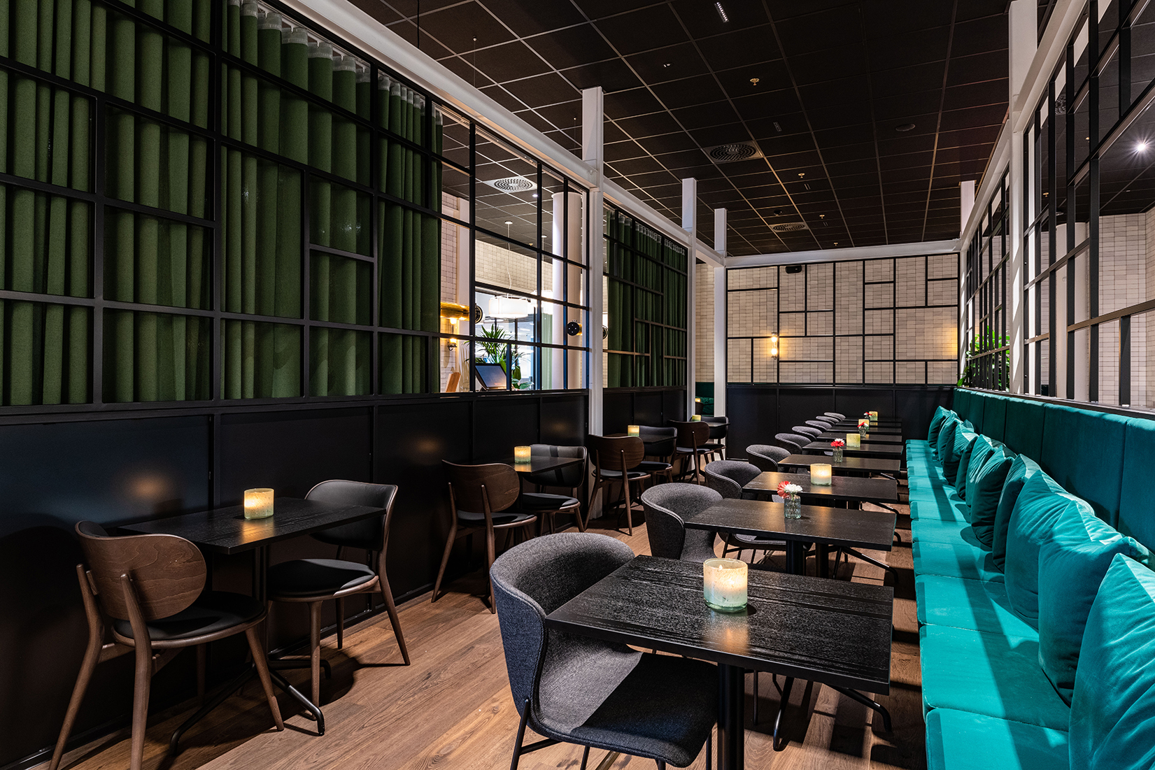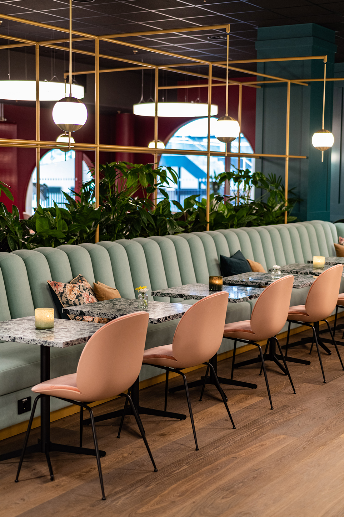 Funksjonene i paviljongen er offentlig tilgjengelige, samt et tilbud for kontorbrukerne. Dette markedsområde består av varierte kafeer og restauranter som serverer alt fra gourmetmåltider til Street Food og kaffe. De ni restaurantene har ulike konsepter og til sammen 1.100 sitteplasser. Her har vi hatt fokus på bærekraftige og funksjonelle løsninger av høy kvalitet, som skal tåle hard bruk i lang tid. Vi jobbet tett med kunde for å finne den optimale møbelpakken til det visuelle uttrykke de ønsket.