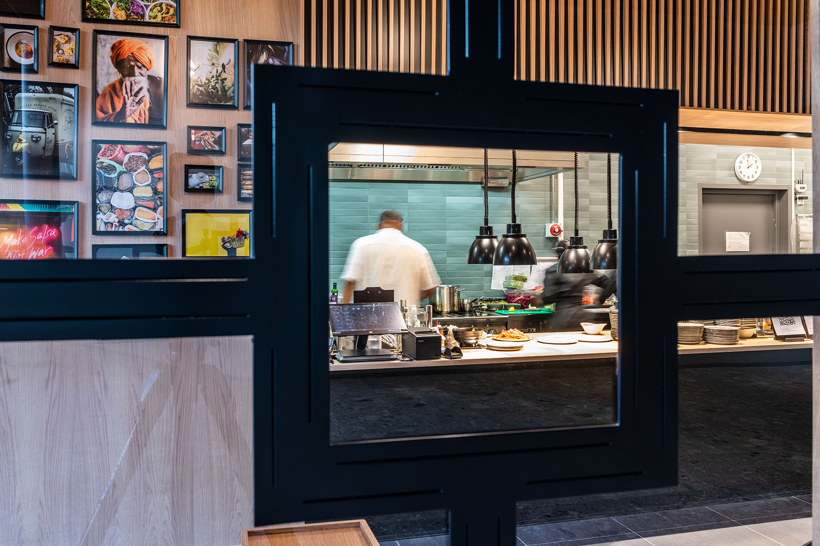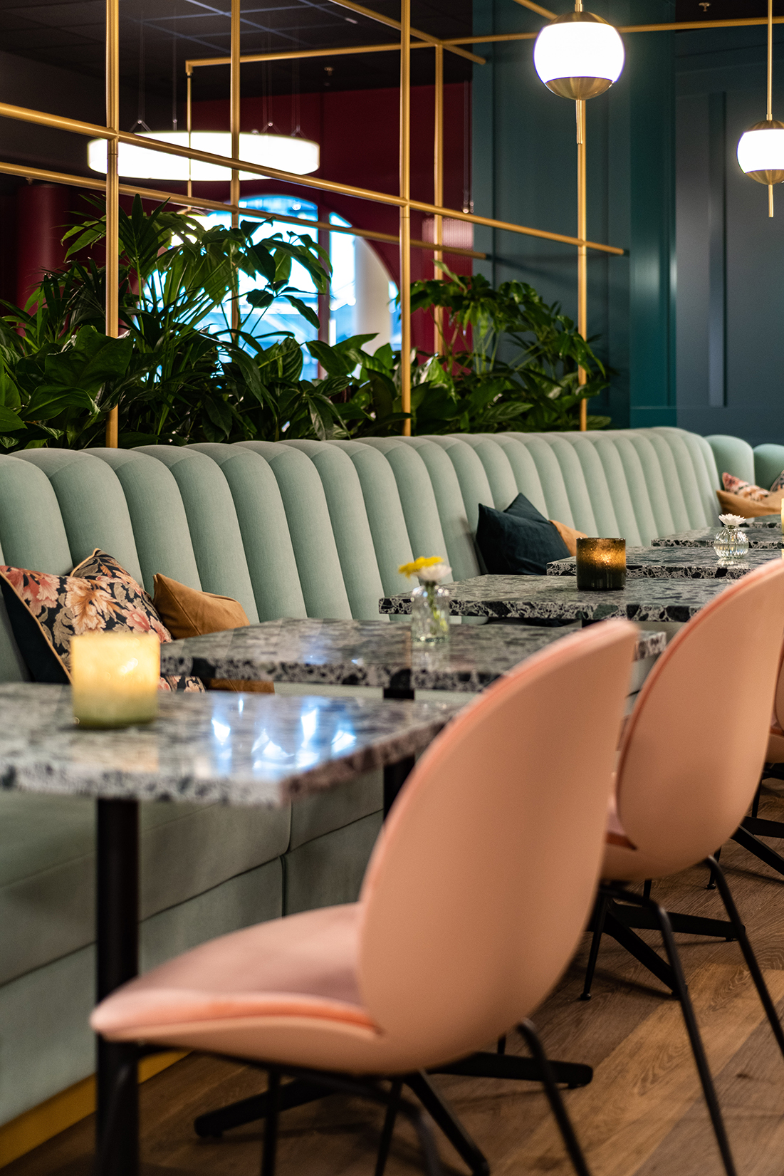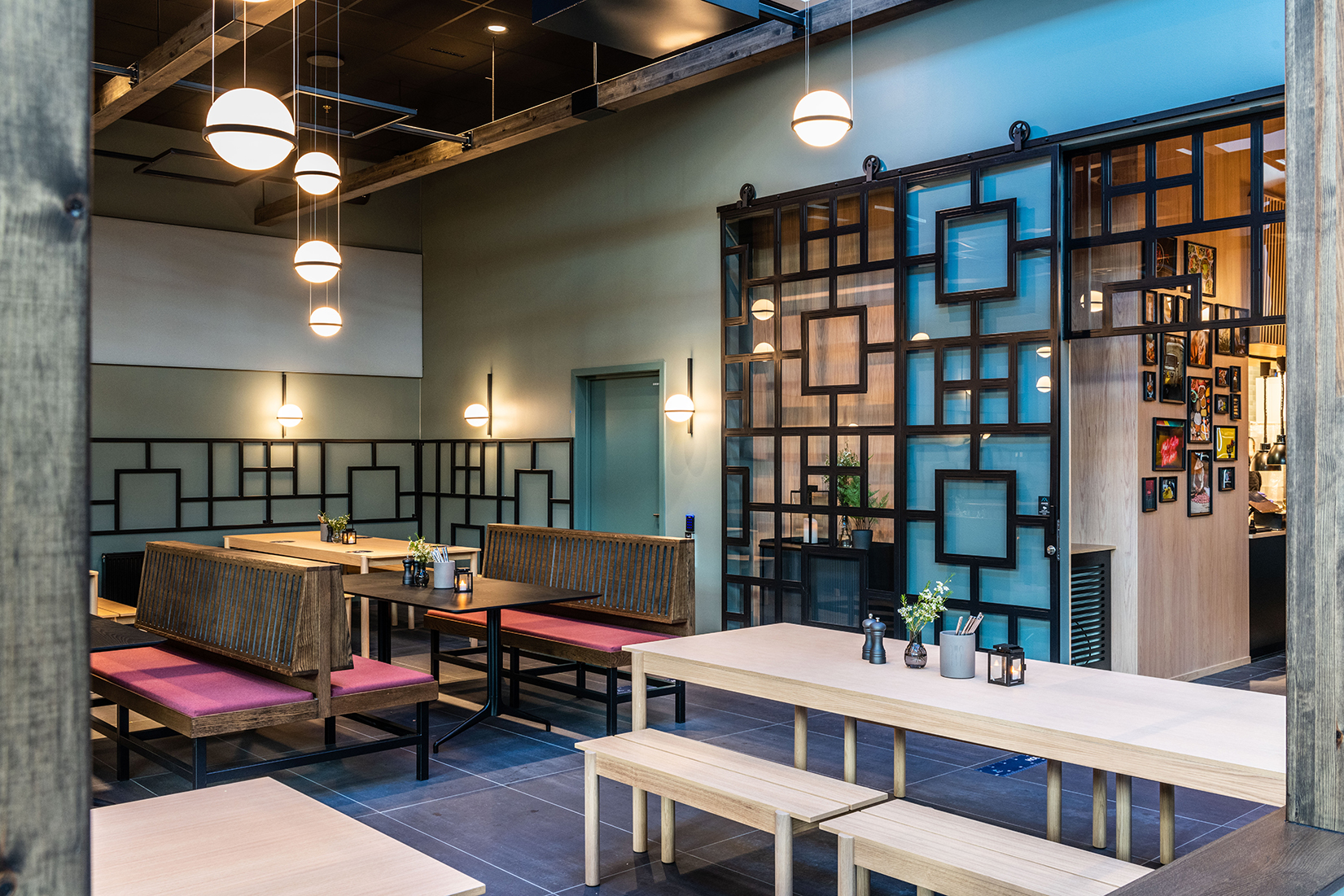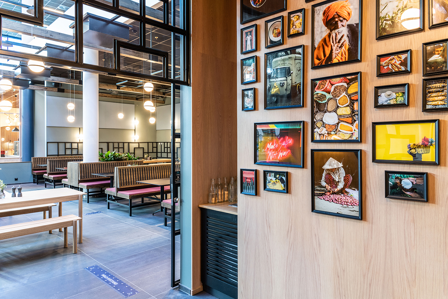 Funksjonene i paviljongen er offentlig tilgjengelige, samt et tilbud for kontorbrukerne. Dette markedsområde består av varierte kafeer og restauranter som serverer alt fra gourmetmåltider til Street Food og kaffe. De ni restaurantene har ulike konsepter og til sammen 1.100 sitteplasser. Her har vi hatt fokus på bærekraftige og funksjonelle løsninger av høy kvalitet, som skal tåle hard bruk i lang tid. Vi jobbet tett med kunde for å finne den optimale møbelpakken til det visuelle uttrykke de ønsket.