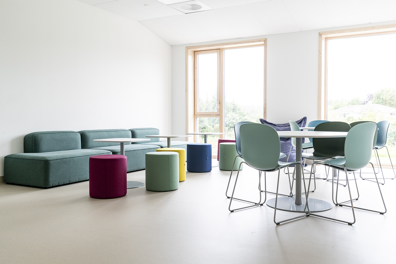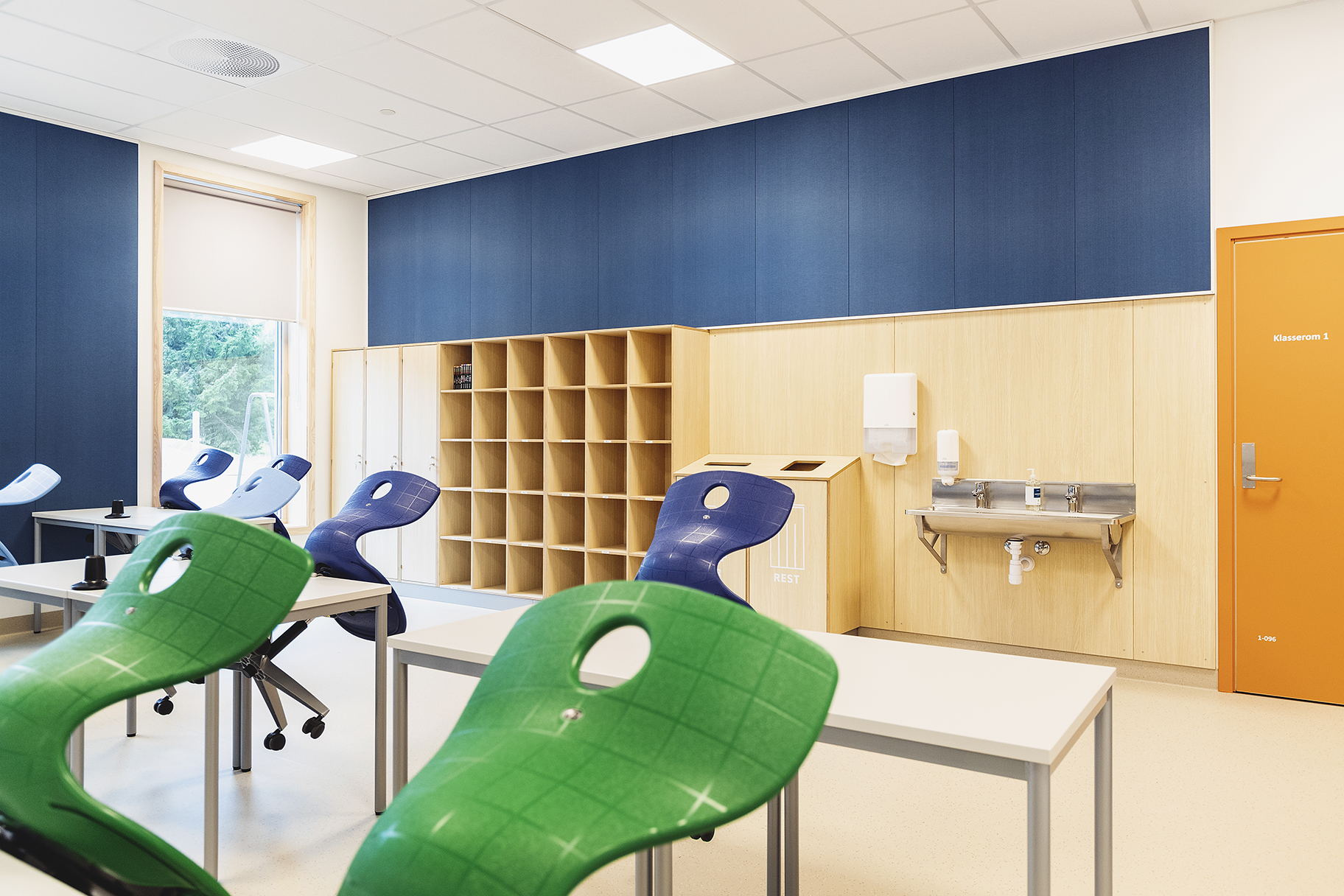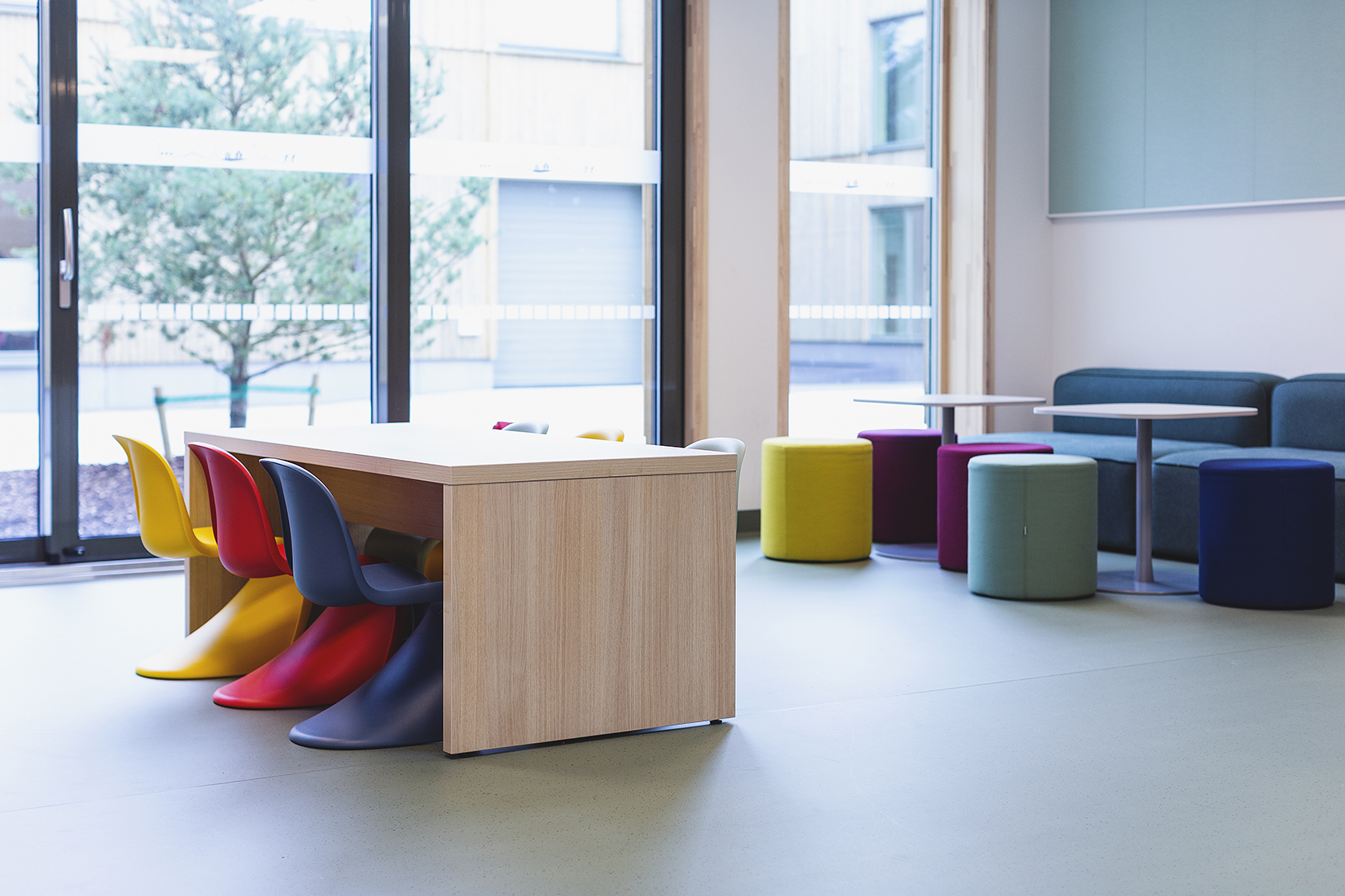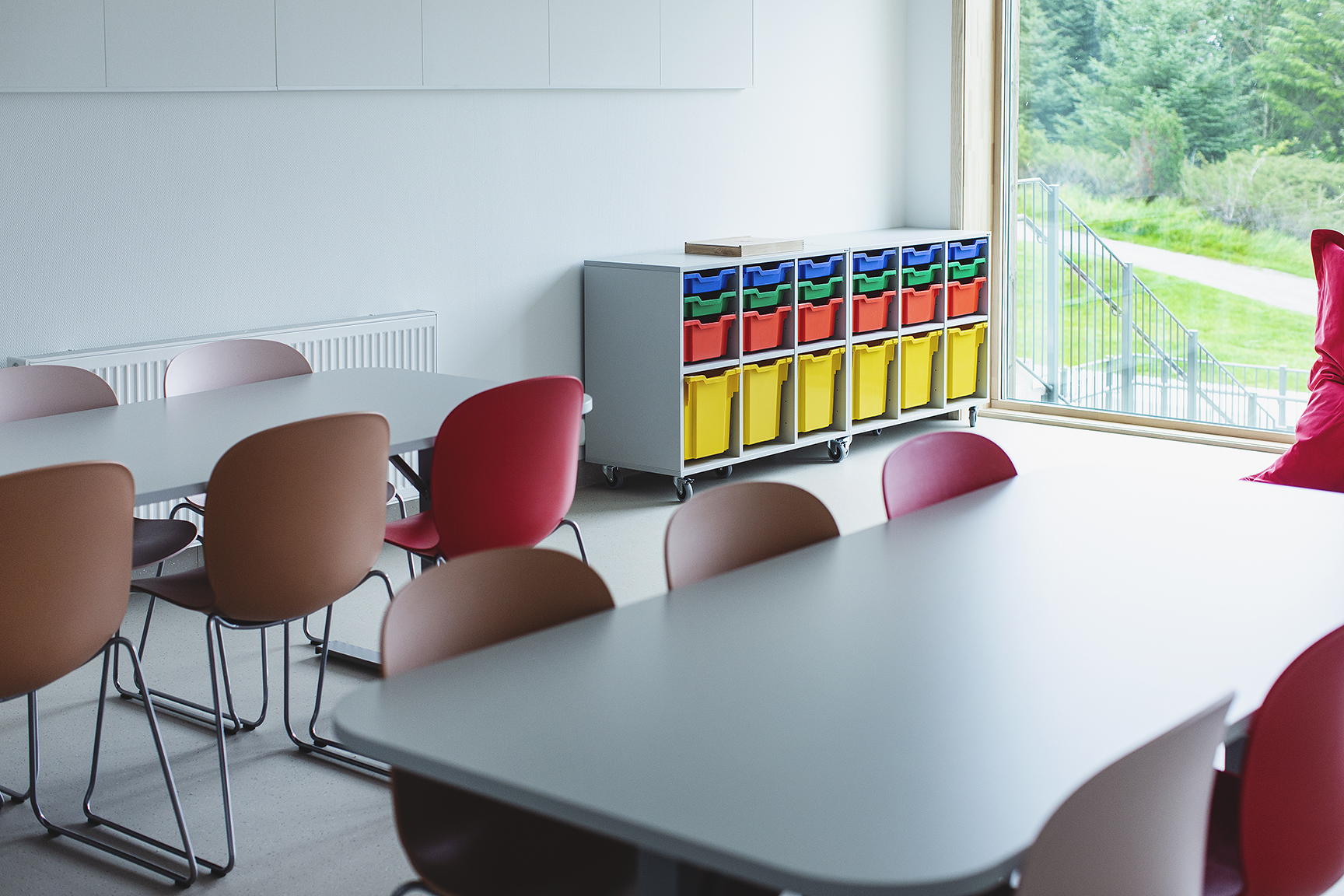 Vi begynte prosessen høsten 2020 med å innrede skolen i godt samarbeid med Karmøy kommune. Arkitekten hadde valgt ut farger og materialer på gulv, vegger og tak. Vi tilpasset oss disse valgene i utvelgelsen og plassering av møbler og fast inventar. Hovedfokuset var å lage en leken skole med masse farger.