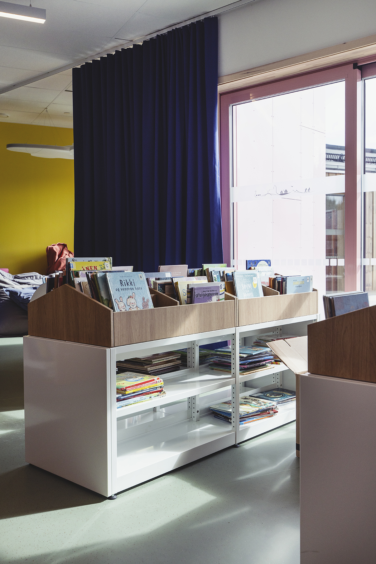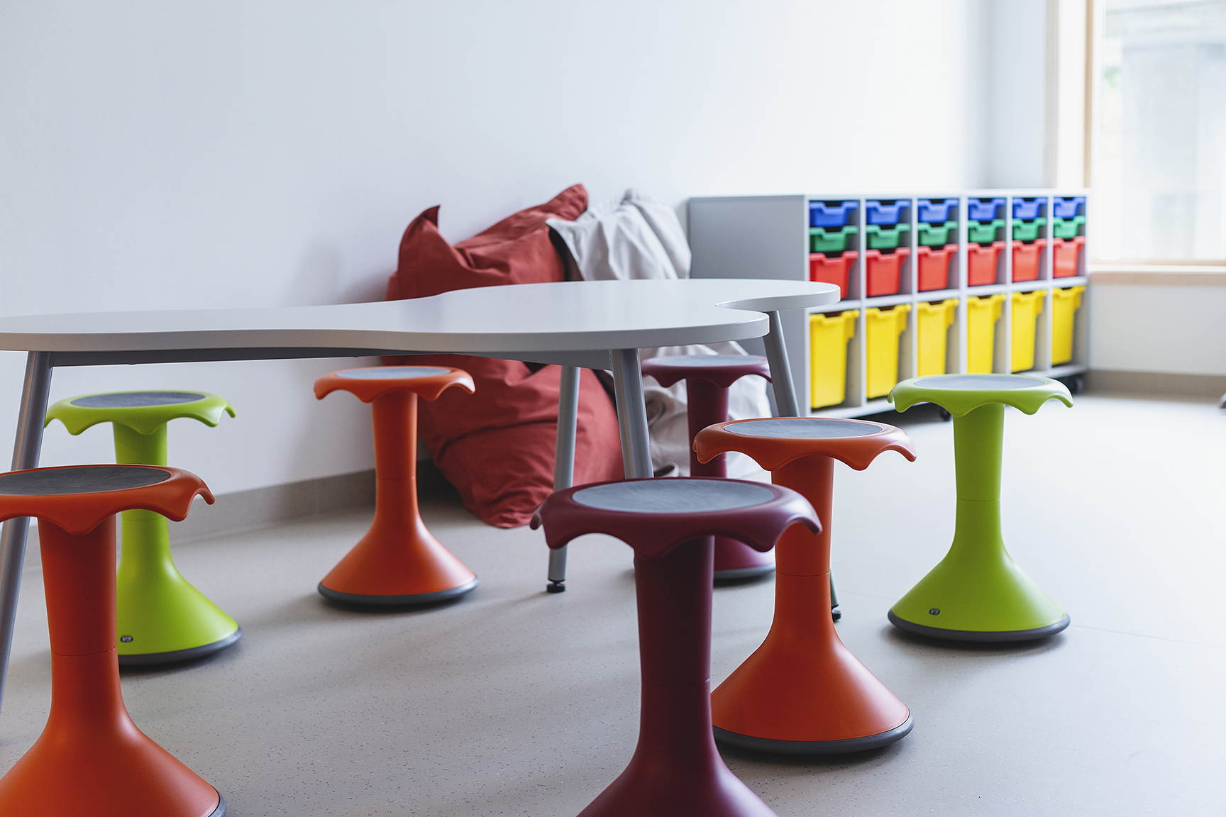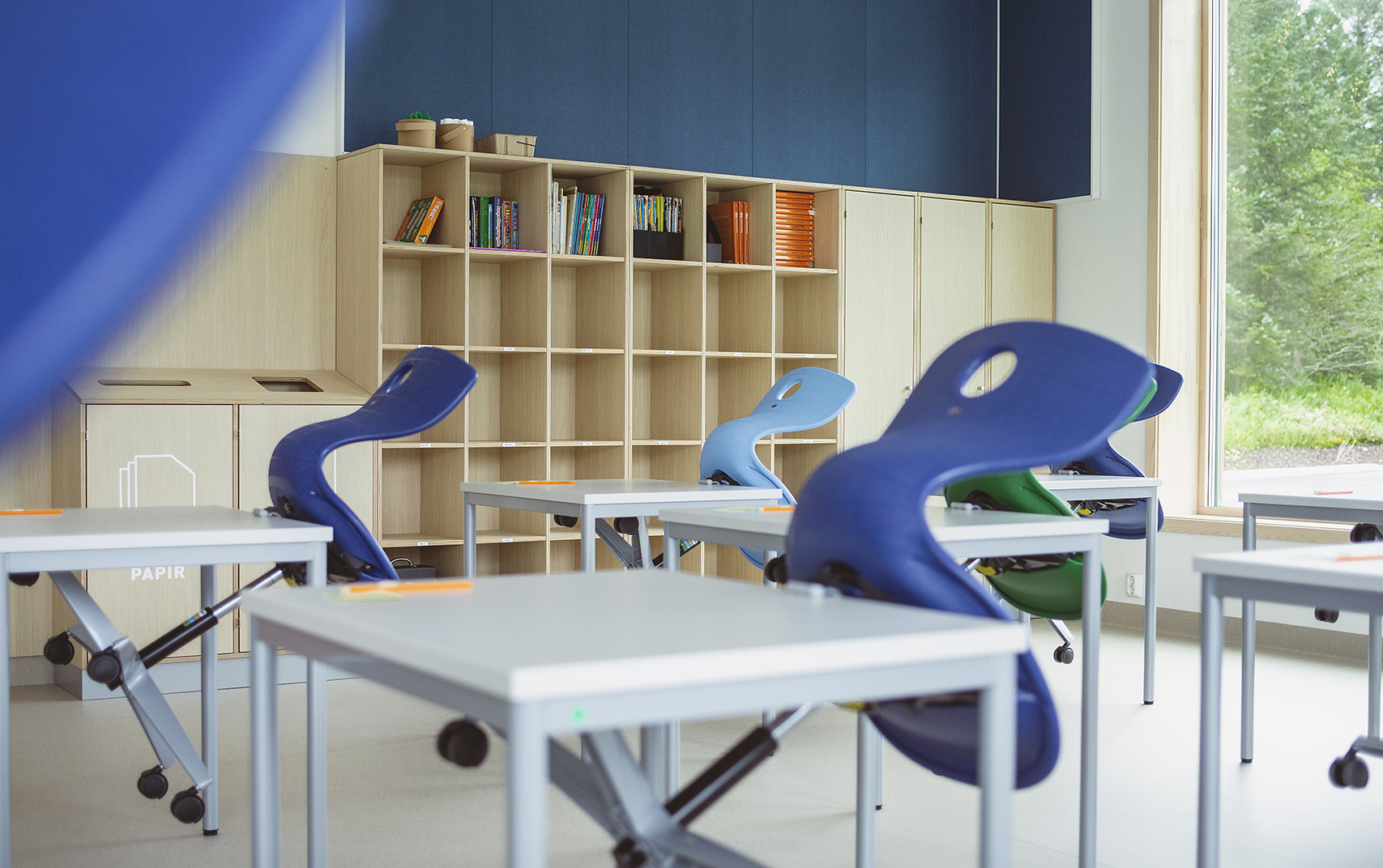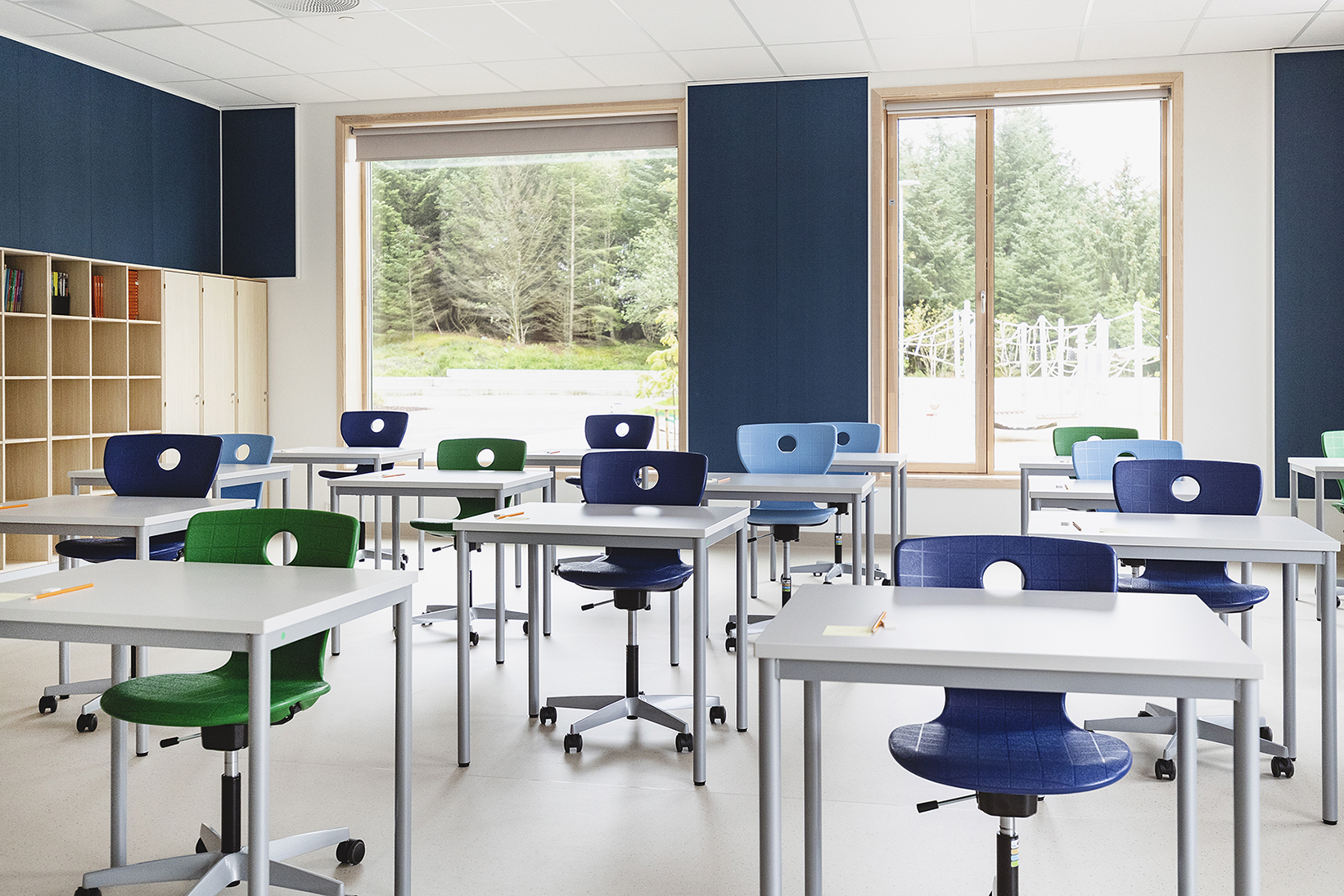 Vi begynte prosessen høsten 2020 med å innrede skolen i godt samarbeid med Karmøy kommune. Arkitekten hadde valgt ut farger og materialer på gulv, vegger og tak. Vi tilpasset oss disse valgene i utvelgelsen og plassering av møbler og fast inventar. Hovedfokuset var å lage en leken skole med masse farger.