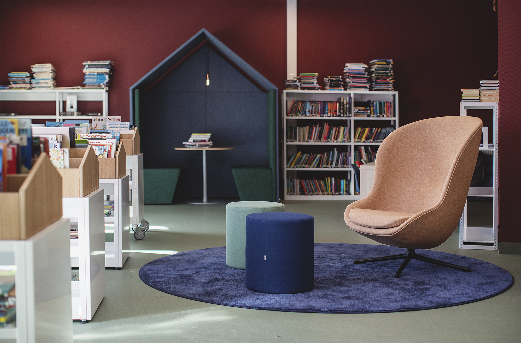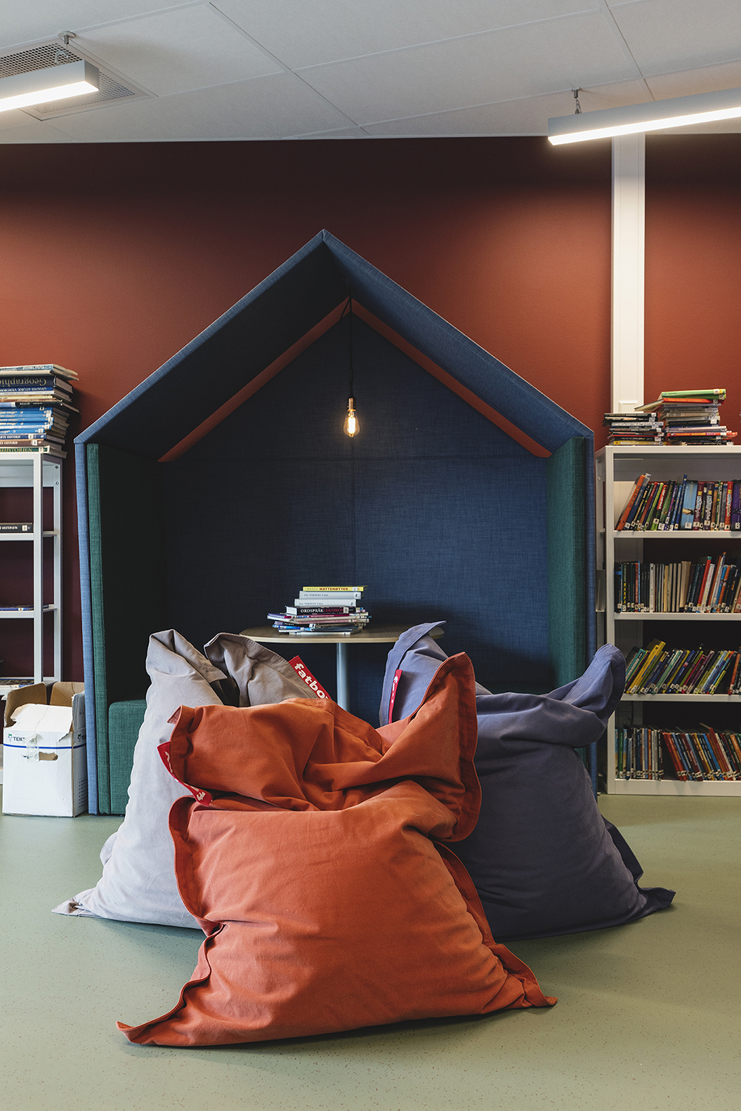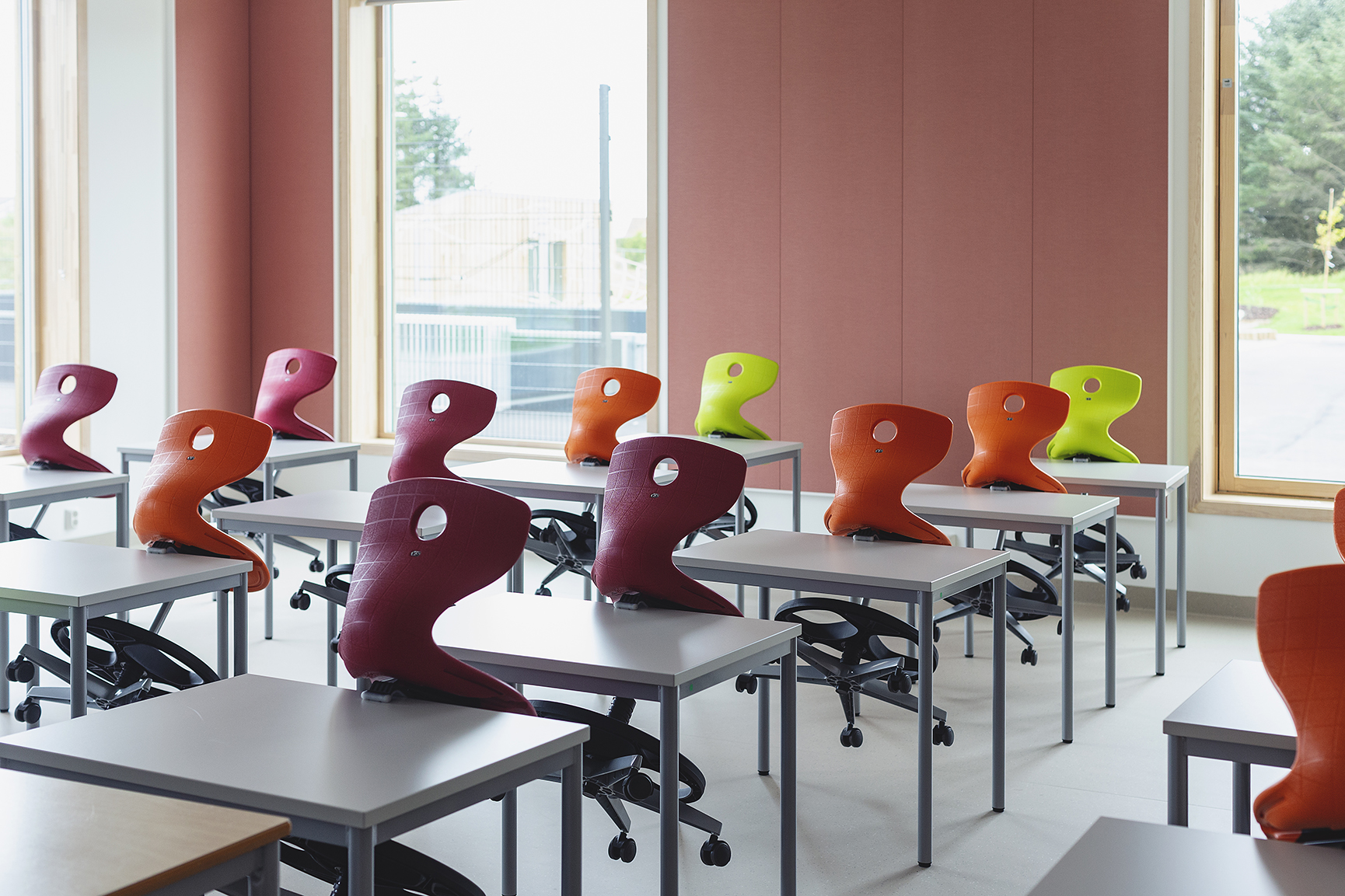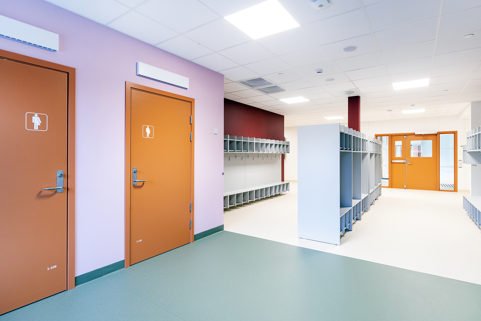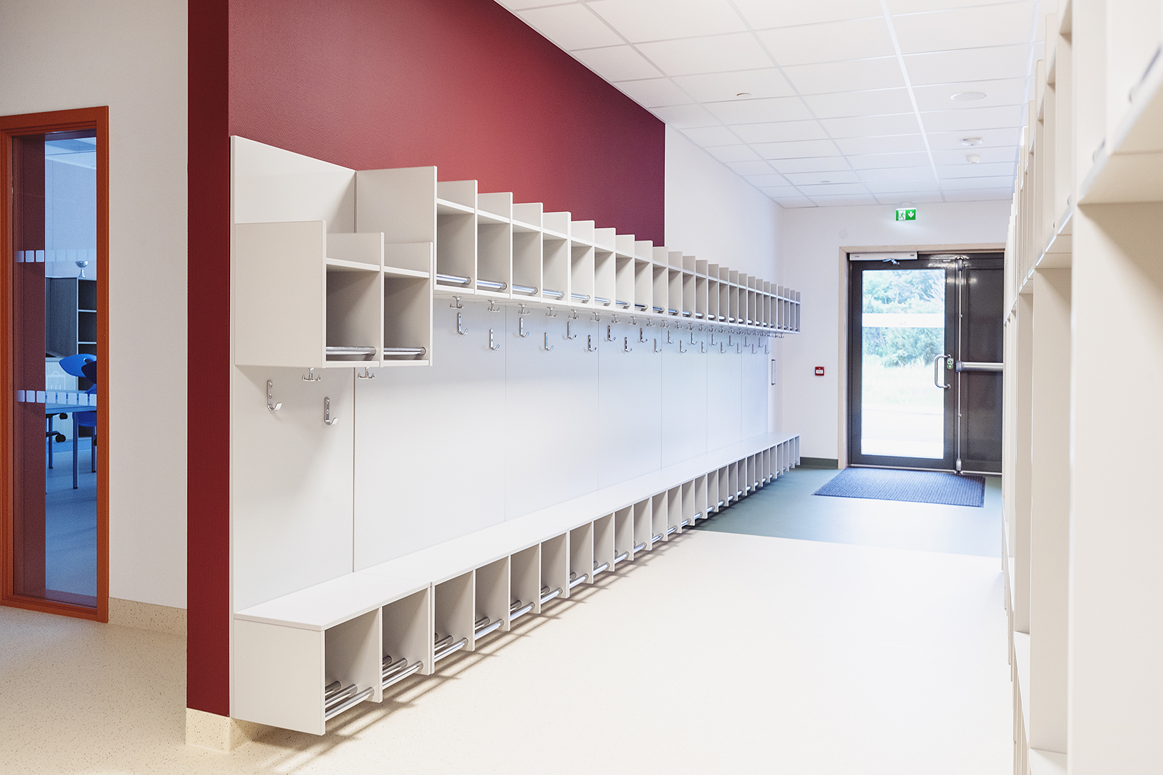 Vi begynte prosessen høsten 2020 med å innrede skolen i godt samarbeid med Karmøy kommune. Arkitekten hadde valgt ut farger og materialer på gulv, vegger og tak. Vi tilpasset oss disse valgene i utvelgelsen og plassering av møbler og fast inventar. Hovedfokuset var å lage en leken skole med masse farger.