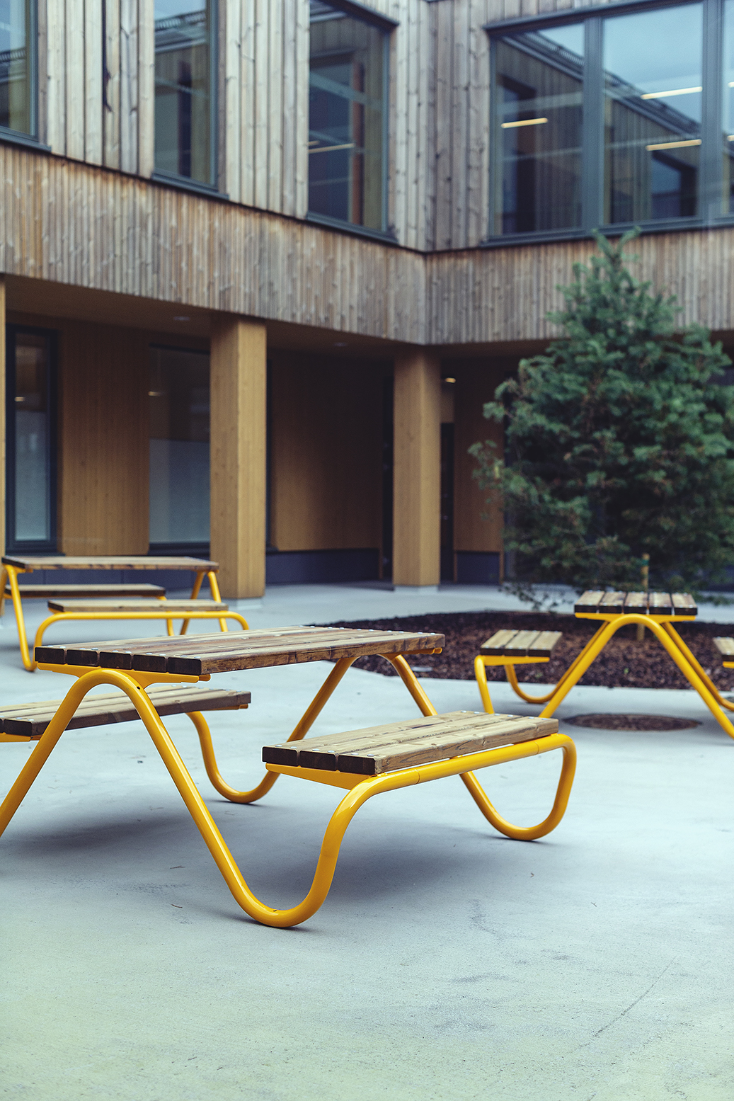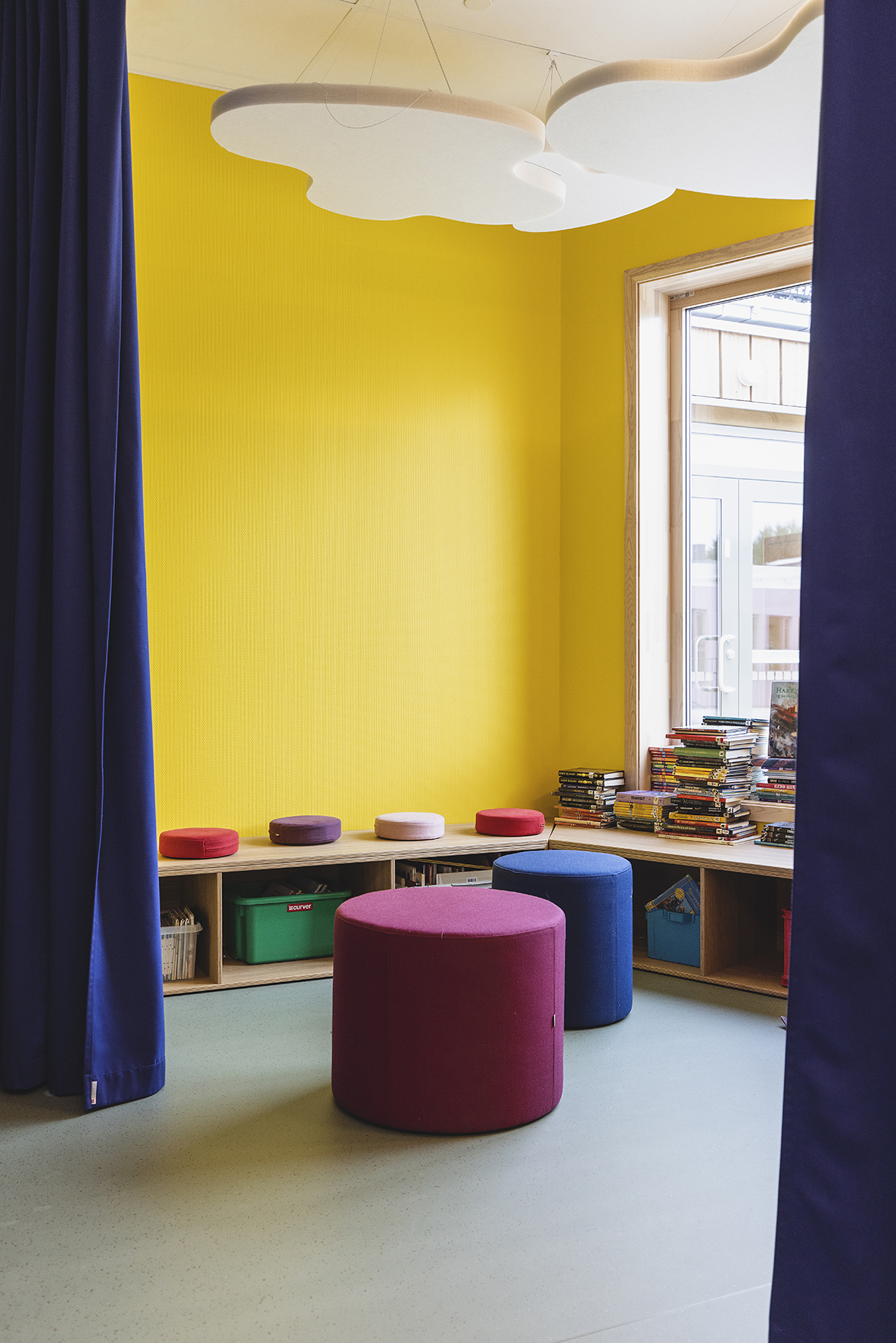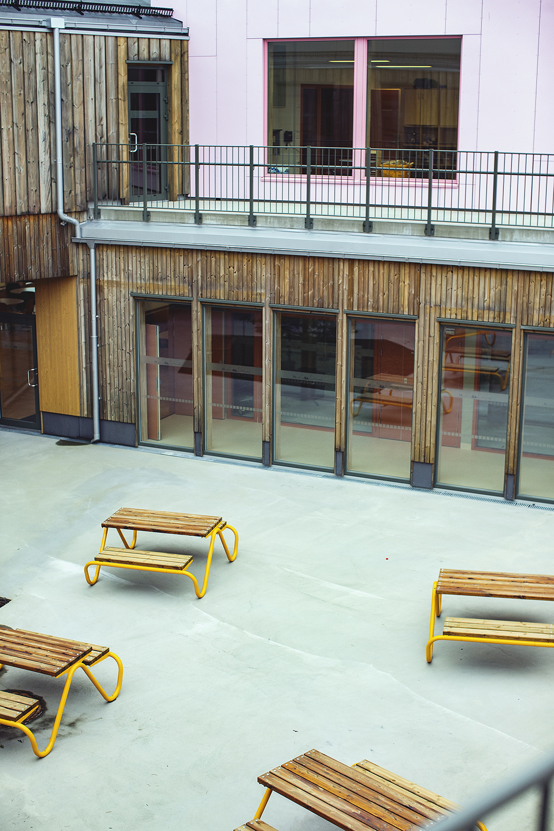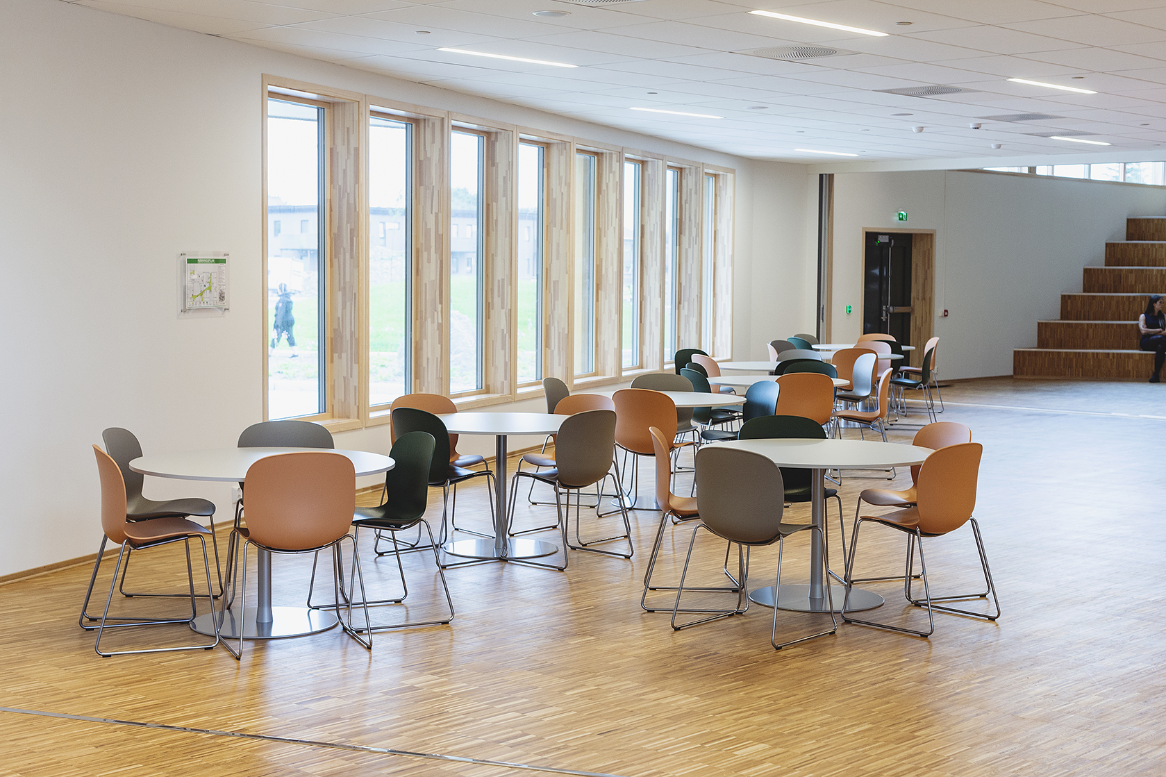 Vi begynte prosessen høsten 2020 med å innrede skolen i godt samarbeid med Karmøy kommune. Arkitekten hadde valgt ut farger og materialer på gulv, vegger og tak. Vi tilpasset oss disse valgene i utvelgelsen og plassering av møbler og fast inventar. Hovedfokuset var å lage en leken skole med masse farger.